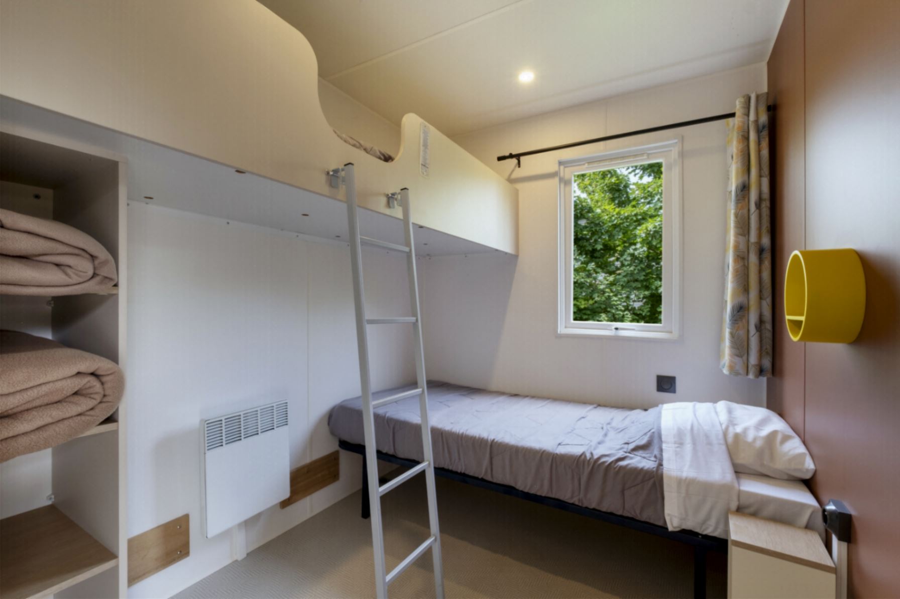 Coin nuit : une chambre avec 1 lit double (140X190), une chambre avec 2 lits simples (90×190) superposés, oreillers et couvertures et/ou couettes fournis.